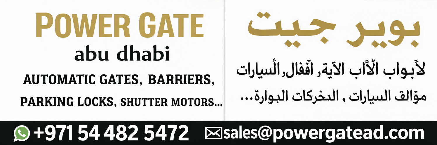 At POWER GATE Abu Dhabi, we provide complete automation solutions across Abu Dhabi, UAE, including Swing Gate Motors for villas, Sliding Gate Motors for main entrances, Garage Door Motors for smooth access, and Roller Shutter Motors for shutters. We also supply Parking Barrier Gates for parking control, Parking Locks for reserved spaces, Photocell Sensors for safety, GSM Gate Openers for remote access, and Gates Flashing Lights for warning signals. In addition, we offer Remote Controls for convenience, Controller Boards for system management, Intercom System for communication, and Access Control System for security, along with Gate Spare Parts for repairs and Garage Spare Parts for maintenance.